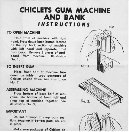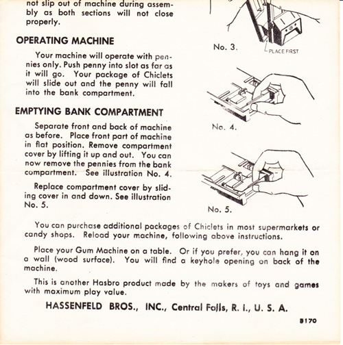 Incredibly, a Chiclets bank still sealed in its original shrink-wrap. I had this one as a child and remember it fondly. From Hassenfeld Bros., Inc., (Hasbro), item number 5170, no date but I believe that it is from 1967 or so. As I had a second copy of the bank that was opened I was able to scan the instructions shown below. The second bank with the different box is probably slightly older than the first one.