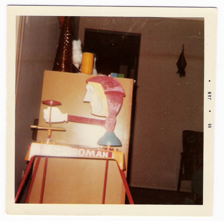 A toybox visitor alerted me to the existance of Spiroman and send me this picture of the one he owned--I had no idea. I immediately started watching eBay for one and after missing out on this pristine set I picked up this copy which the original owner attacked with gold spray paint. Kids these days (or those days). The set appears complete including the instructions and design book but has some breaks in the plastic base where the front legs go in so I can't set it up. Hopefully I'll fix it with some fiberglass, something I'm all too familiar with on these old toys, and take a picture with Spiroman set up and in action. Item number 432 dated 1968.
